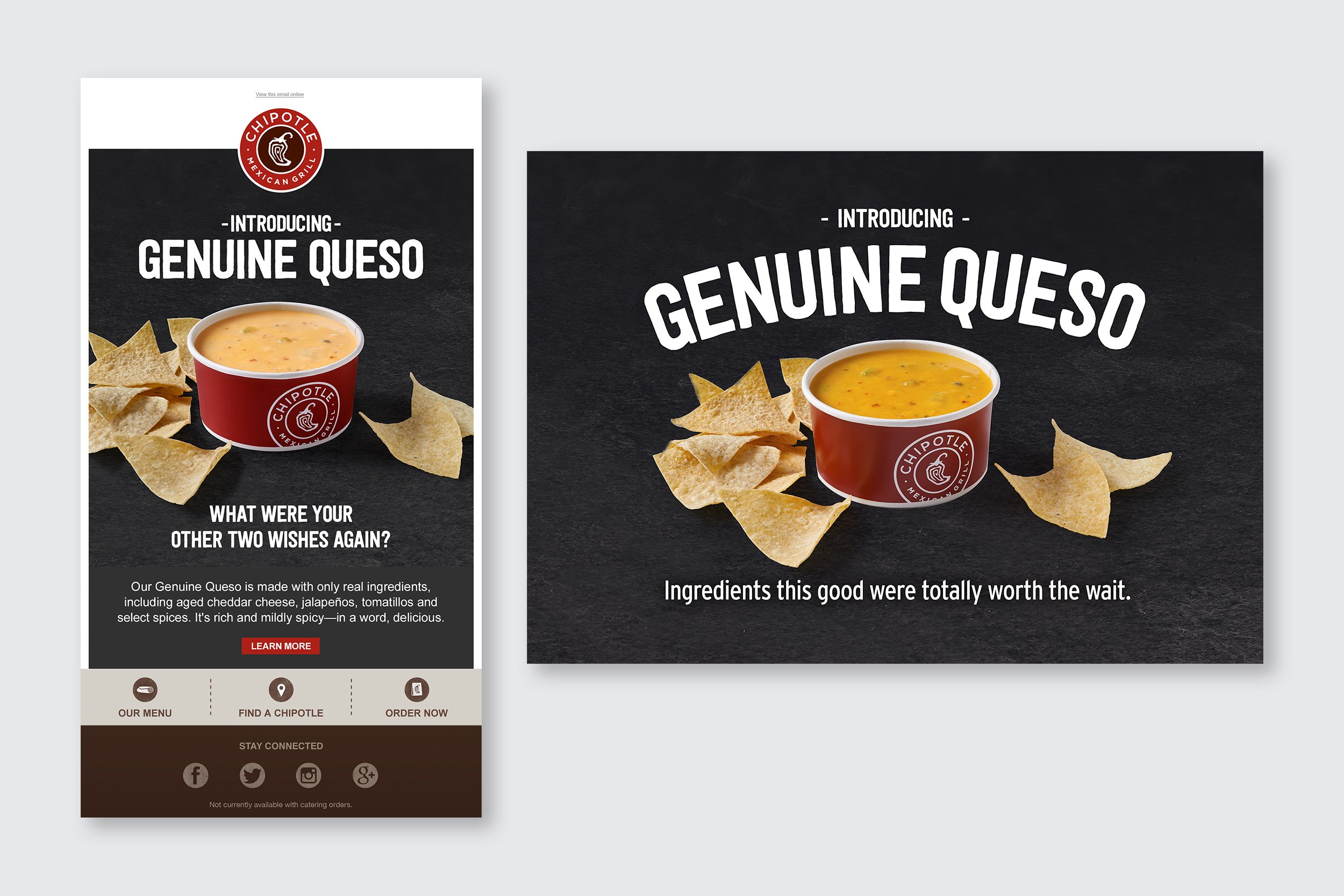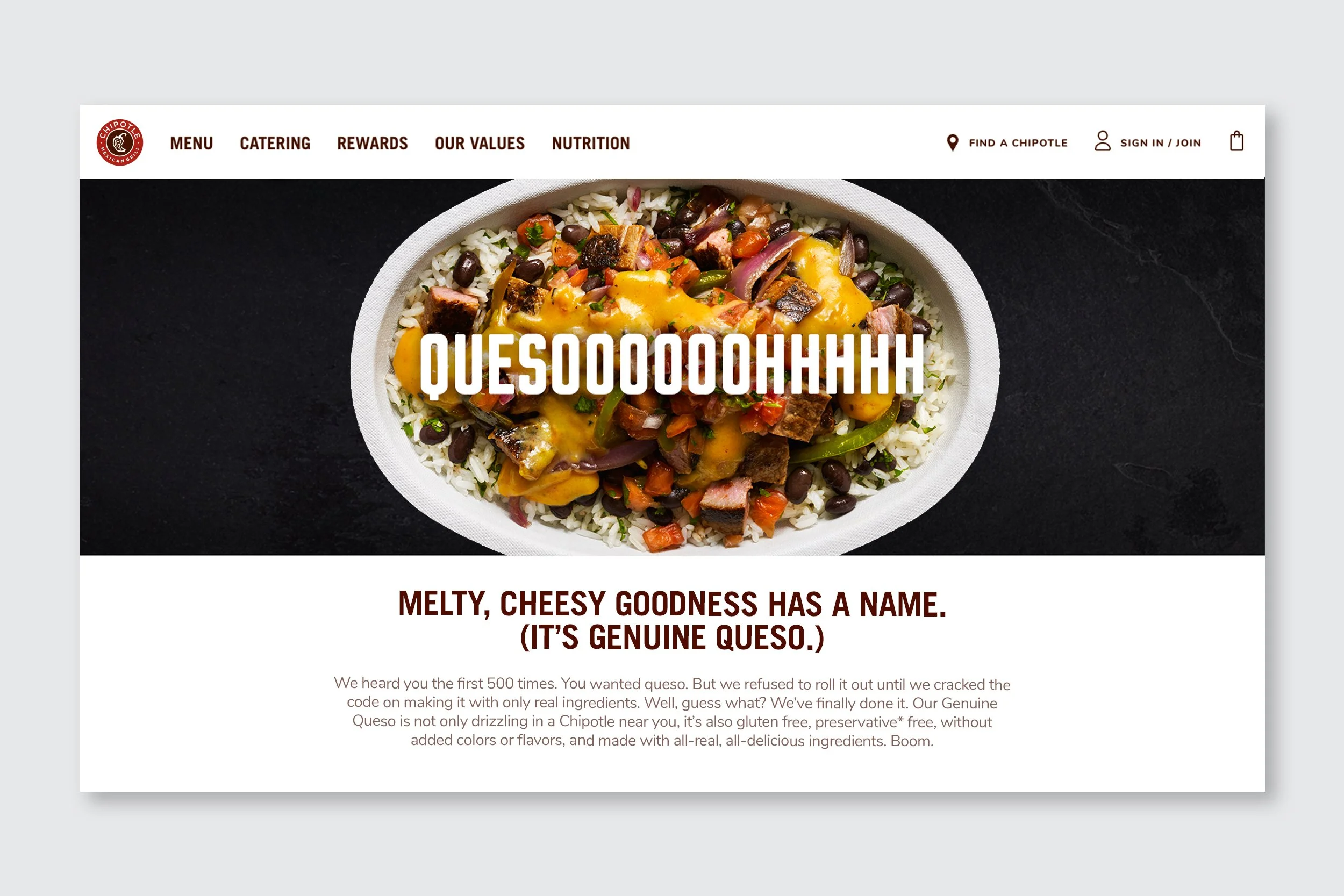 After years of anticipation (and plenty of tweets asking for it), Chipotle finally introduced queso to the menu. I concepted and designed the launch campaign - spanning web, social, paid media, OOH, and in-store touchpoints - to celebrate the arrival of Genuine Queso. Bold and unmistakably Chipotle, the creative leaned into fan energy and turned a long-awaited product drop into a nationwide moment.