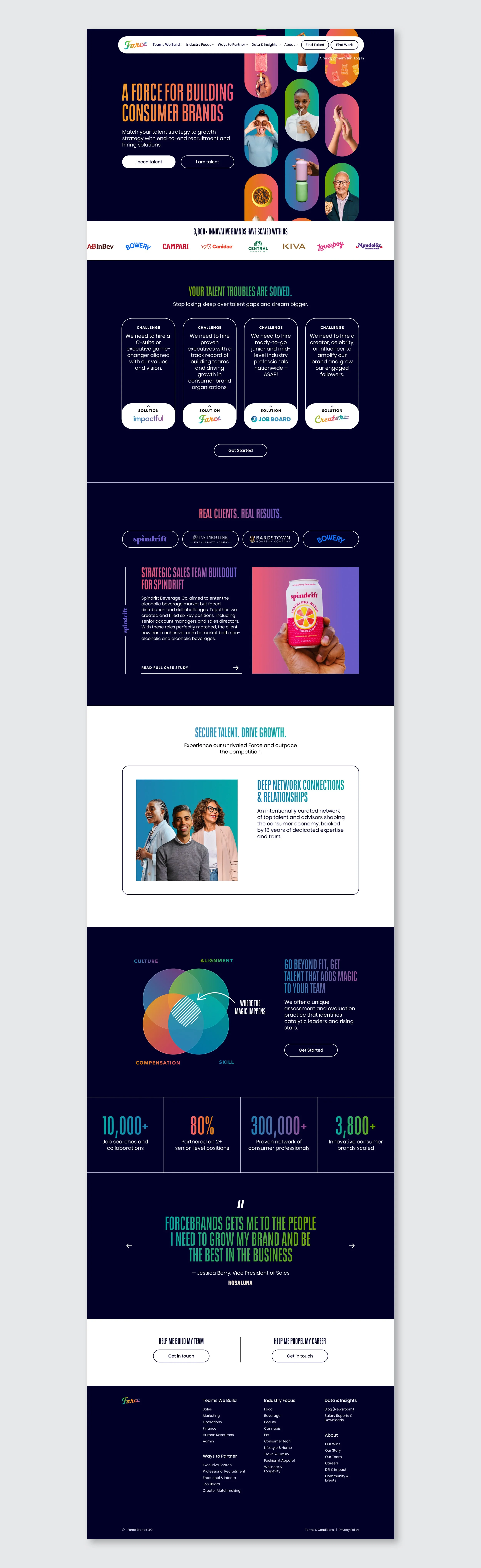 A full-scale refresh of the ForceBrands homepage, modernizing the brand’s digital presence to reflect its evolution as a leader in consumer brand recruitment. The redesign unifies our talent solutions under one cohesive story, simplifying user journeys while elevating the visual system with bold color, clean typography, and lifestyle-driven imagery. The result: a dynamic, human-centered experience that balances professionalism with personality and drives conversion across talent and client pathways.